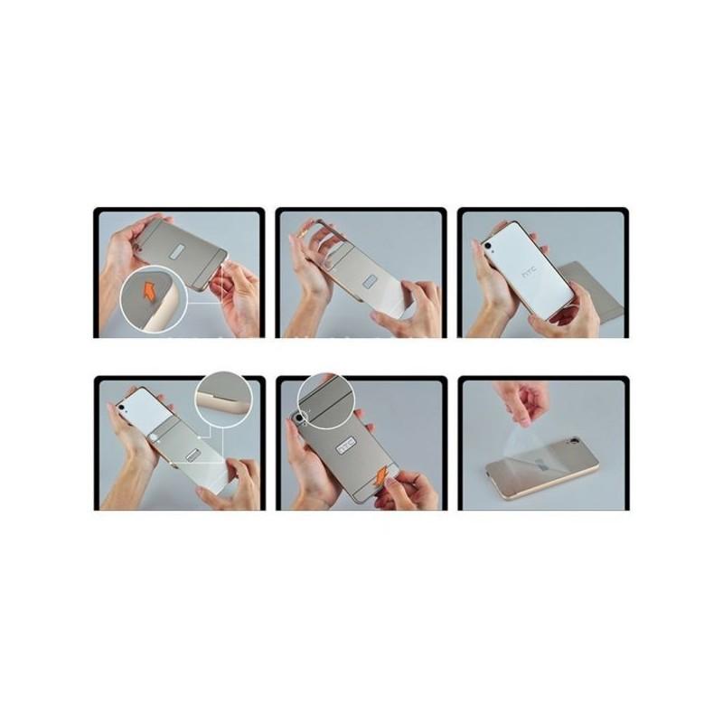 Zadnjo stranico izvlečete počasi iz okvirja,pazljivo da jo ne prepogibate, vstavite aparat in potisnete nazaj zadnji del,tako da zaskoči.Zadnji del ima zaščitno nalepko,ki jo odstranite.Glej slike .