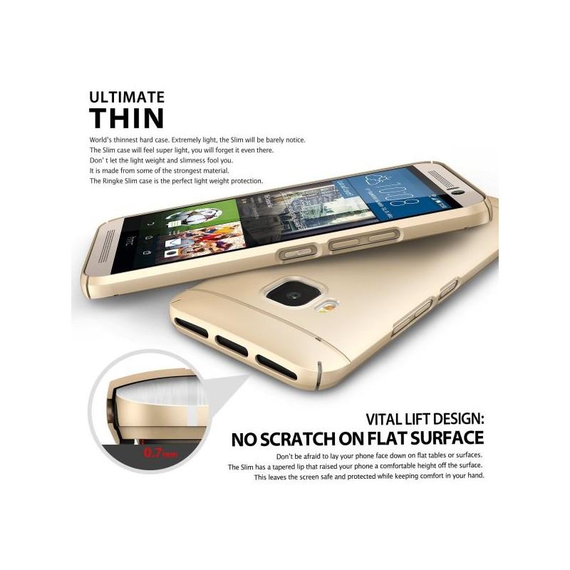 Ringke Slim - je najbolj priljubljena linija zaščite za model HTC One M9,ohrani minimalističen dizajn. Narejen je iz trpežnega polikarbonata. Zelo lahek in ultra-tanek. Barva: Royal Gold +Priložena folija za ekran.
