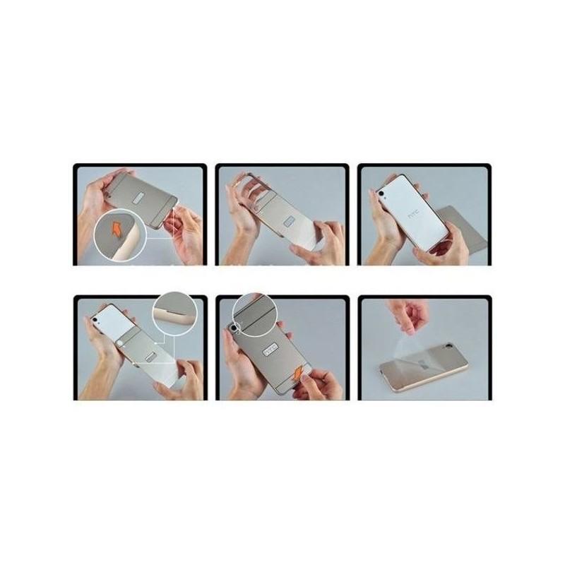 Zadnjo stranico izvlečete počasi iz okvirja,pazljivo da jo ne prepogibate, vstavite aparat in potisnete nazaj zadnji del,tako da zaskoči.Zadnji del ima zaščitno nalepko,ki jo odstranite.Glej slike .