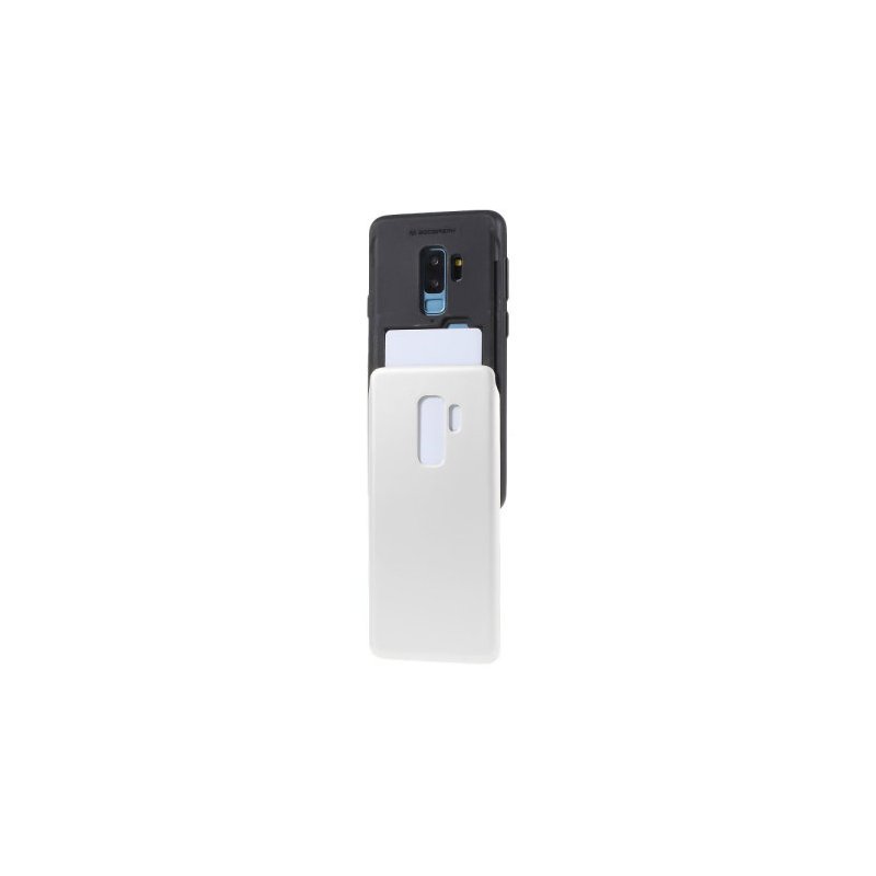 Etui priznanega proizvajalca Mercury, narejen iz kombinacije plastike in TPU, s skritim prostorom za dve bančni kartici. Ustreza za Samsung Galaxy S9. Srebrna barva.